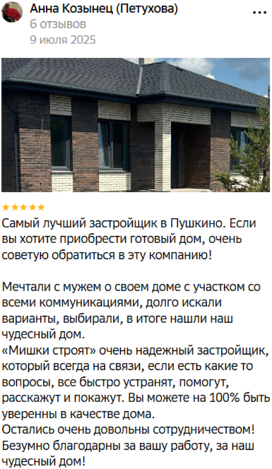Мы даём гарантию 5 лет, ведём фото и видеоотчёты по этапам, подключаем независимый контроль качества, а также проводим живые экскурсии и показываем шоурумы в готовых домах.